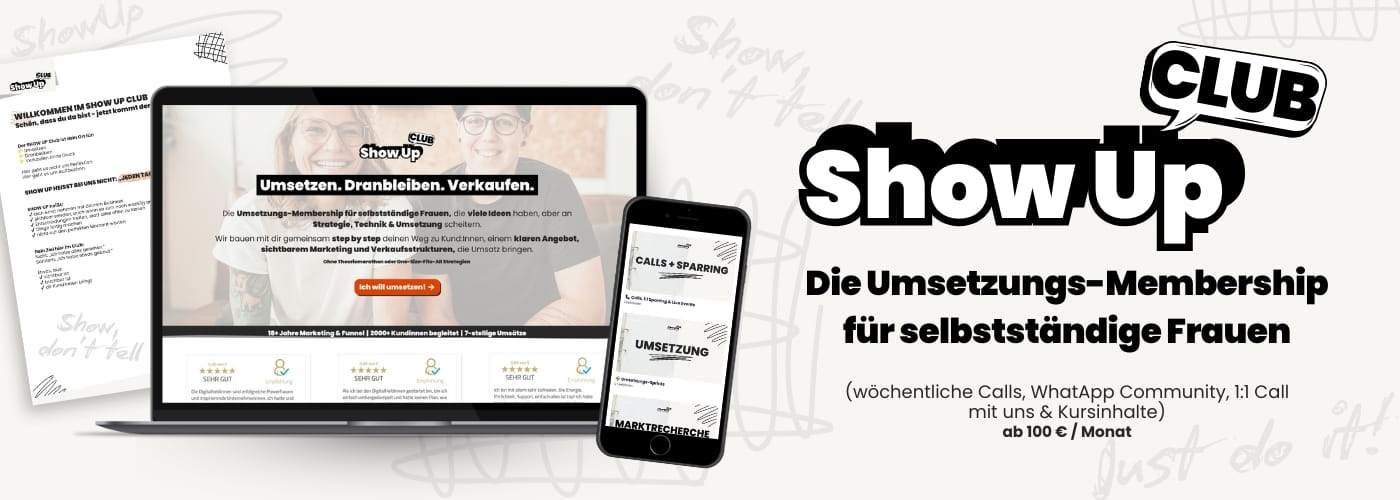 Der Club ist eine Umsetzungs-Membership für selbstständige Frauen, die viele Ideen haben, aber an Strategie, Technik & Umsetzung scheitern. Er lebt von den wöchentlichen Calls, der Community, den 1:1 Calls mit uns und den Kursinhalten
